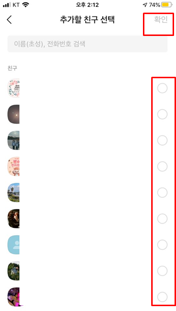 목록에서 추가할 친구를 선택한 후 확인을 누릅니다.